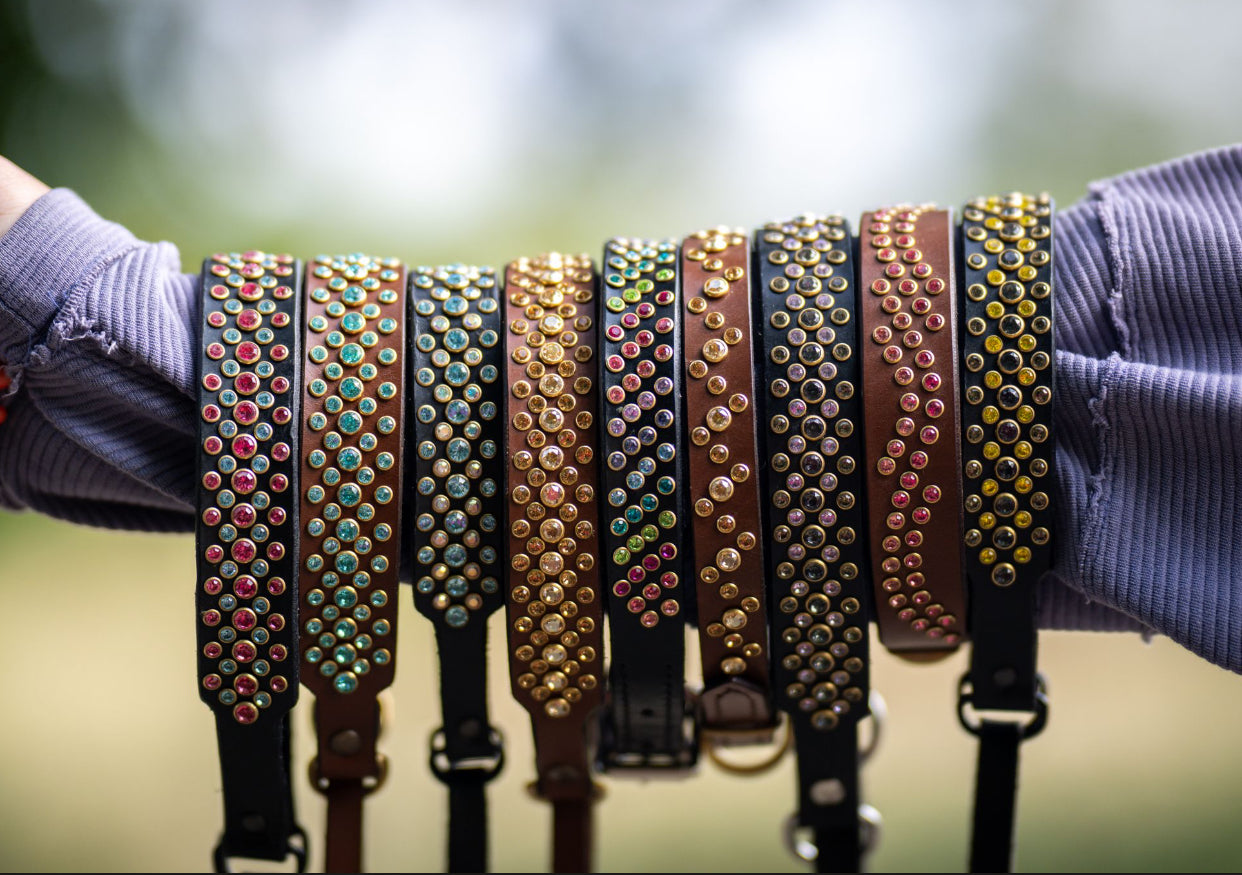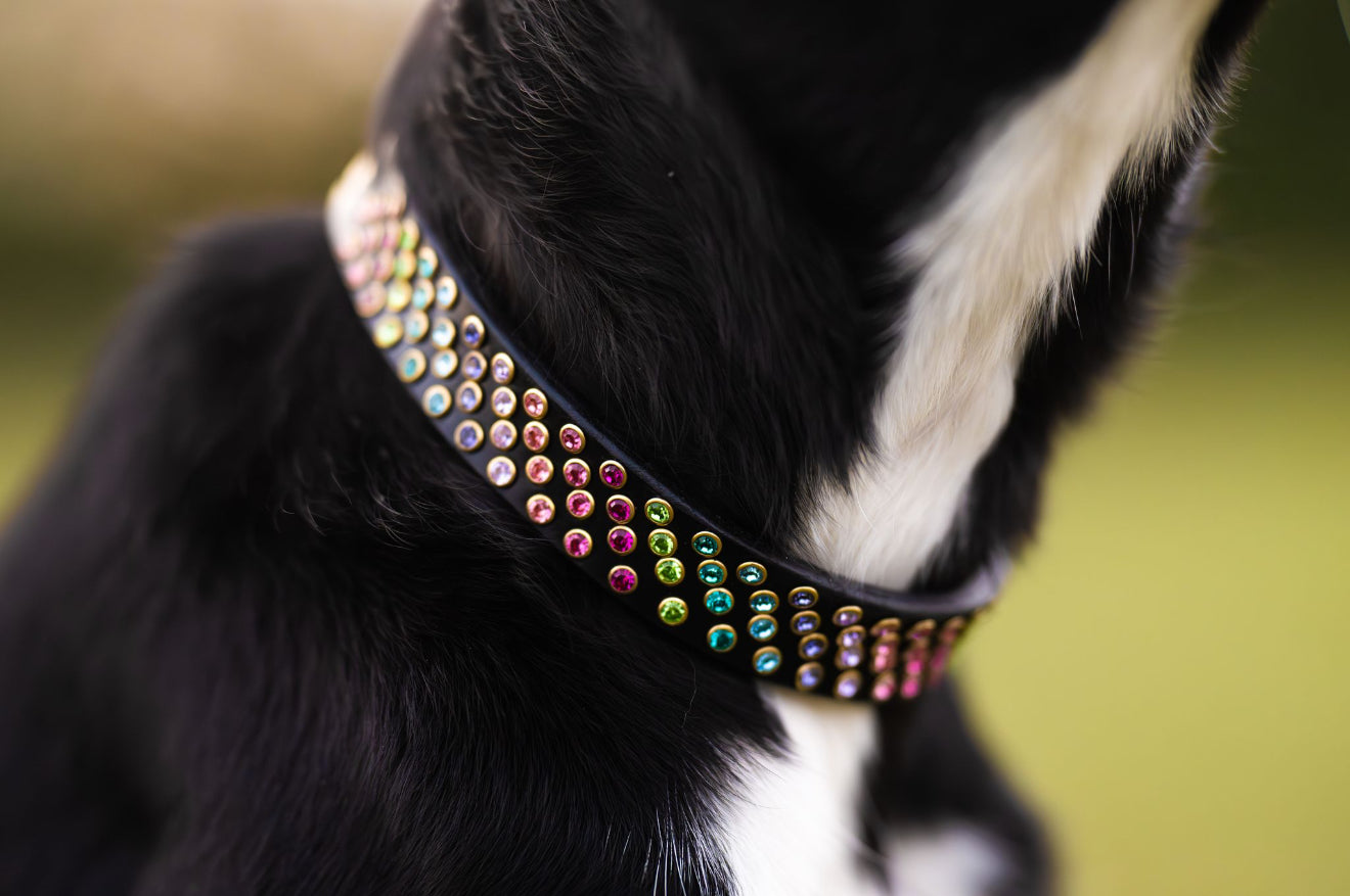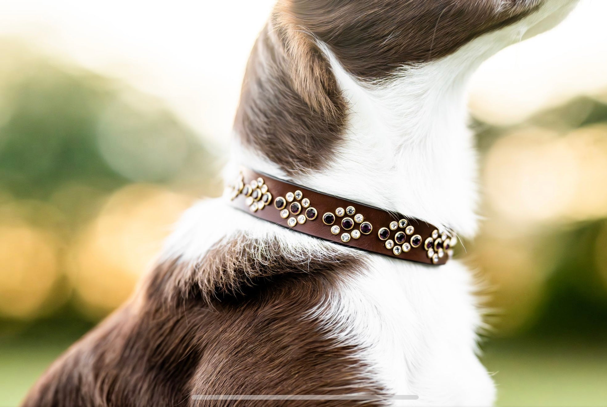 Asked Naarah if she would make Chutney a collar with orange crystals. Straight away I was shown different options of coloured crystals to go with orange, different widths and colour of leather and which fastening I preferred. I also had to send a picture of his original collar next to a tape measure so the size would be spot on. Naarah couldn’t have been more helpful. A week later my lovely sparkly collar was made. A perfect size and looks stunning on Chutney. When Naarah handed it to me she said if there were any problems with it to take it back to her and she would put it right, what more could you ask for. The best leather has been used and the workmanship is excellent. Thank you Naarah for Chutney’s beautiful crystal collar that is admired by everyone.